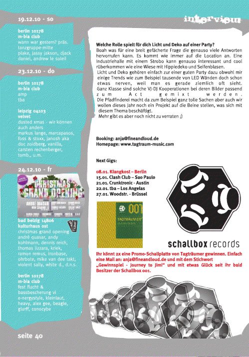 Doch man sollte selber auch nicht die Füße still halten. Ich schreibe immer noch viele Clubs an, mache Kontakte mit Residents und versuche ständig mit der Agentur neue Projekte zu finden, um Tagträumer bekannter zu machen.
